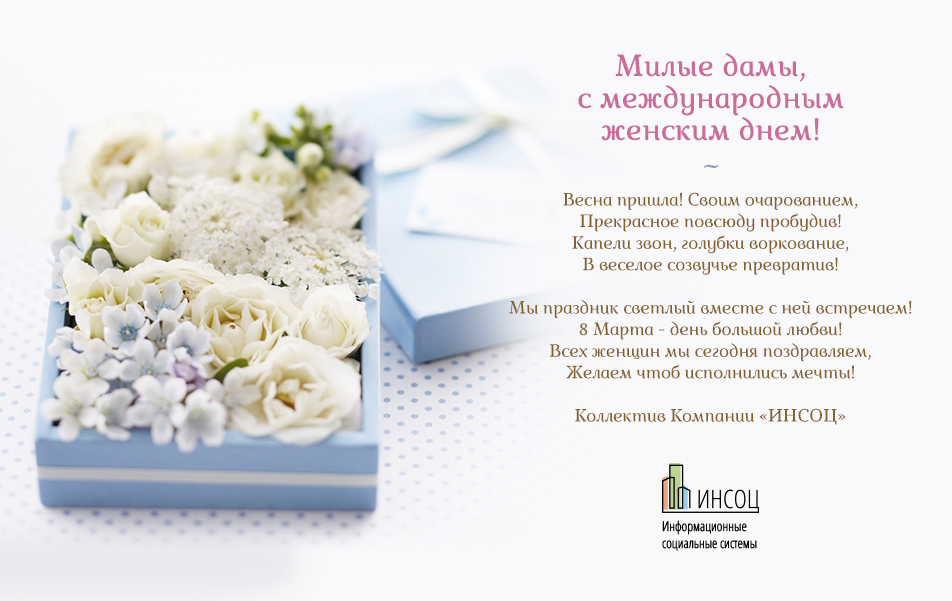 Милые дамы, позвольте пожелать вам вечной молодости и неувядающей красоты, пусть здоровье с каждым годом крепнет, а настроение всегда будет отличным! Пусть в этот праздник дома вас ждут цветы и подарки, веселый смех и добрые пожелания!
